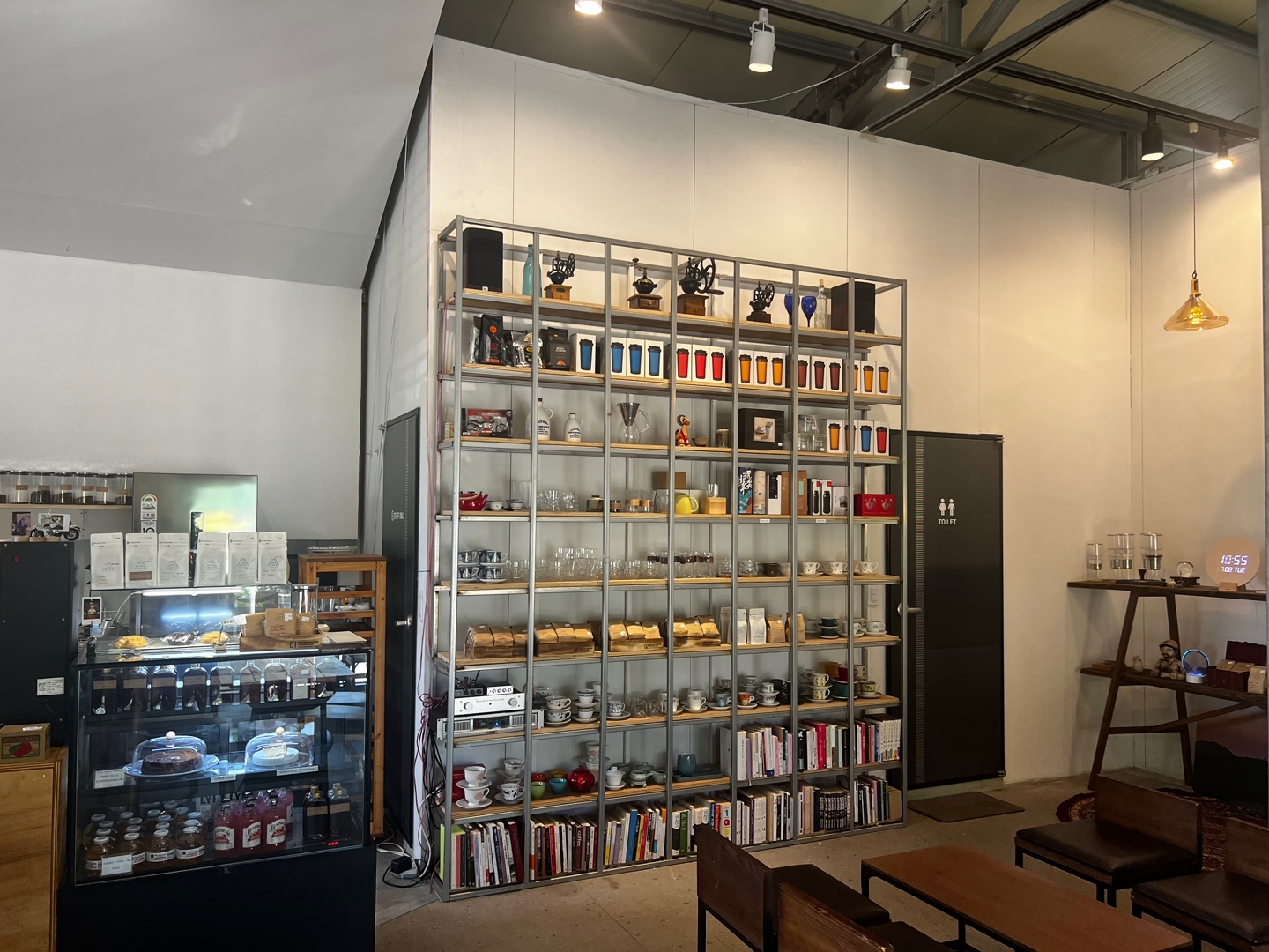 - 한쪽 벽면은 책과 커피 소품, 찻잔으로 가득한 대형 선반