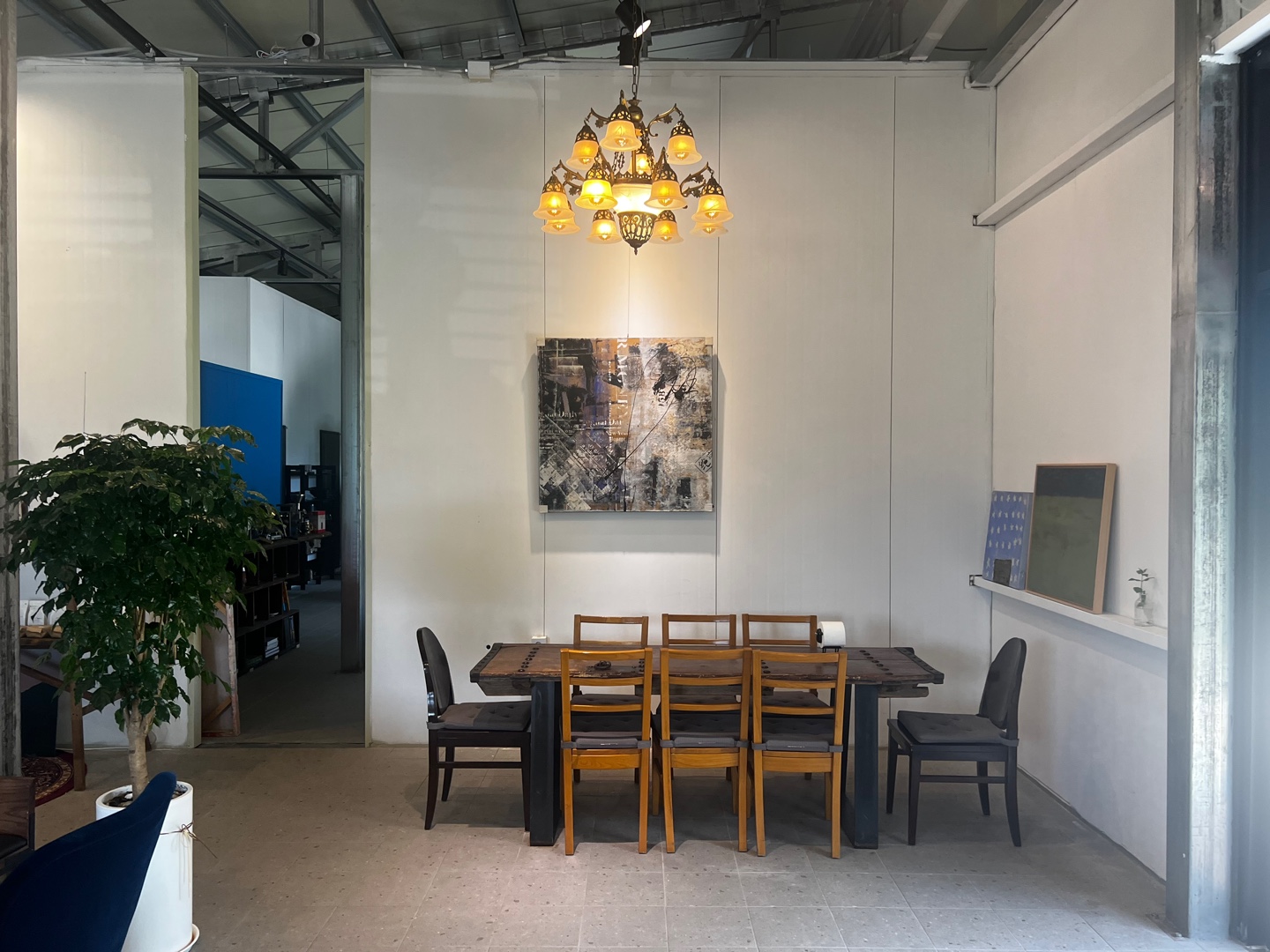 벽면에는 현대미술 작품이 걸려 있고, 한쪽에는 작은 전시 코너처럼 꾸며진 공간도 보입니다.
