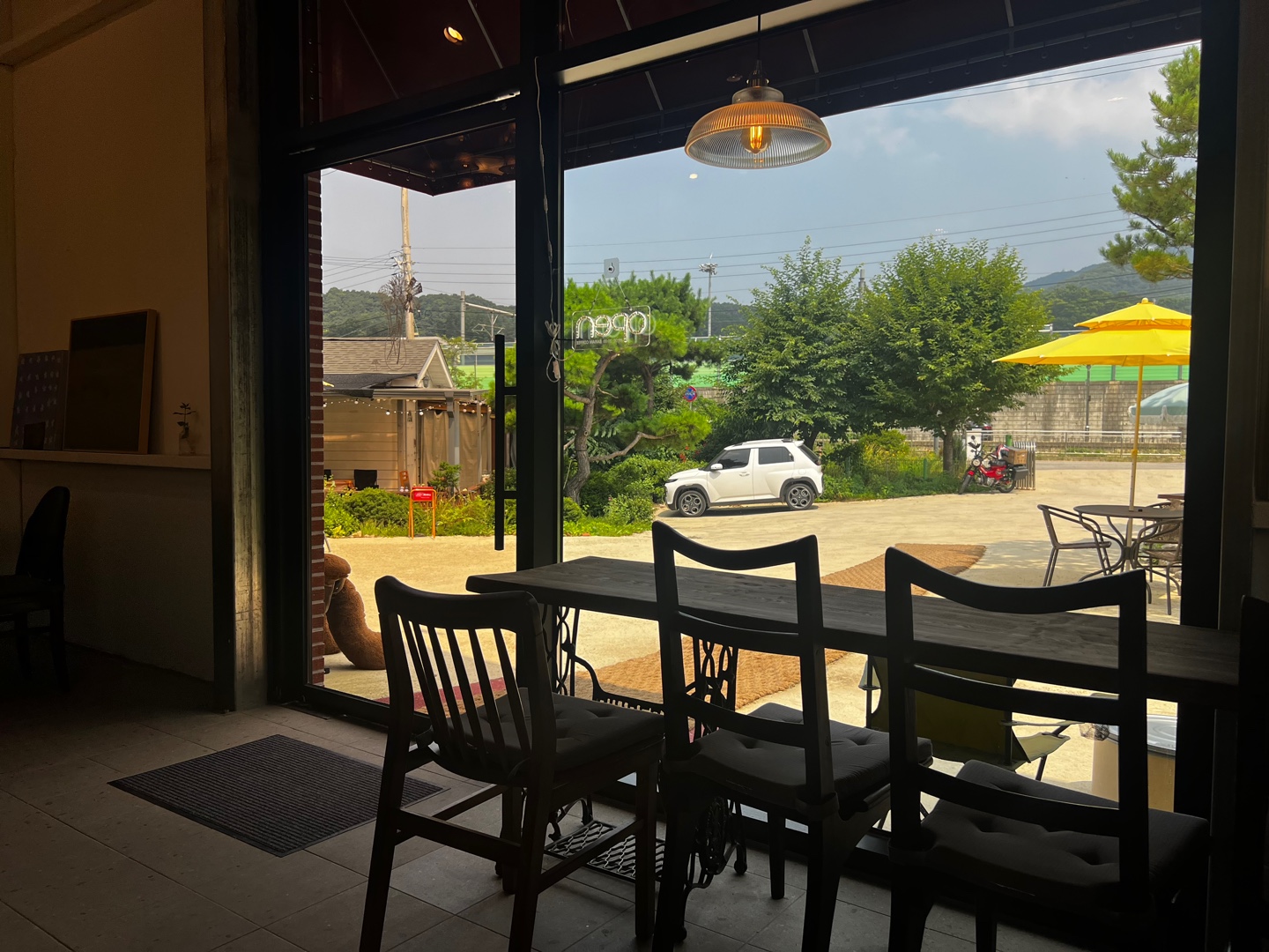야외 테라스에는 노란 파라솔 아래 테이블이 마련되어 있어 날씨 좋은 날엔 밖에서 커피 한 잔의 여유를 즐기기에도 완벽해요.