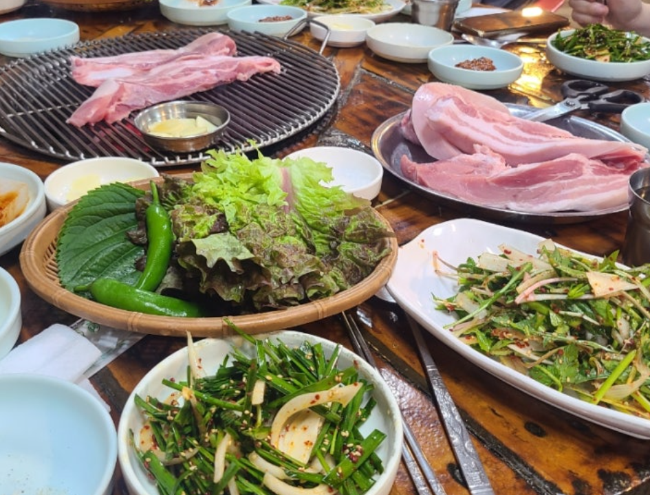 - 기본 반찬으로 나오는 신선한 쌈채소, 김치, 마늘이 고기와 완벽한 조화